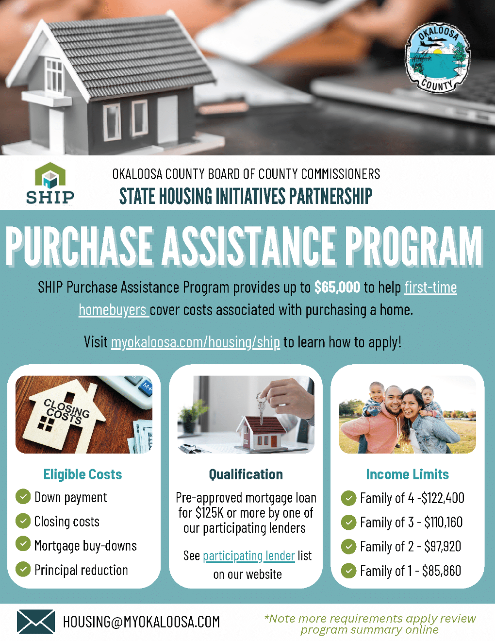 First-Time* Home Buyers *MAY* qualify for Purchase Assistance assistance through Okaloosa County Housing’s SHIP Program using a participating lender while funds last. Contact Mendy Gregory with Community Bank today to learn more and see if you qualify!